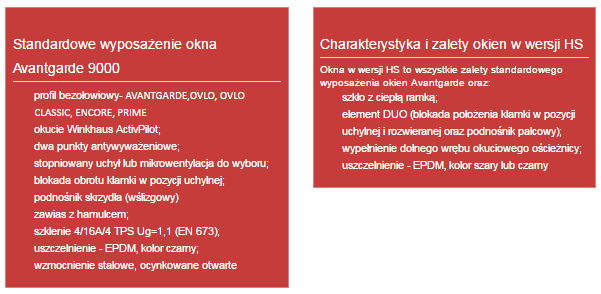 Okna wykonane z półzlicowanego profila Avantgarde 9000 zapewniają optymalną izolacyjność cieplną i akustyczną. Możliwe jest zastosowanie szyb zespolonych o współczynniku Ug=0,7 W/m2K, co znacząco obniża koszty zużycia energii. Śnieżna biel i trwałość koloru oraz możliwość wyboru kolorów oklein podnoszą walory estetyczne produktu.