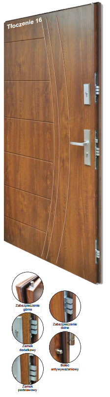Skrzydło wyposażono w system mocnych zamków wielopunktowych. Zamki posiadają 5 klasę odporności na włamanie. W wyposażeniu standardowym znajduje się 6 stałych bolców, które podczas zamykania drzwi wchodzą w gniazda zamontowane w ościeżnicy uniemożliwiając wypchnięcie skrzydła.