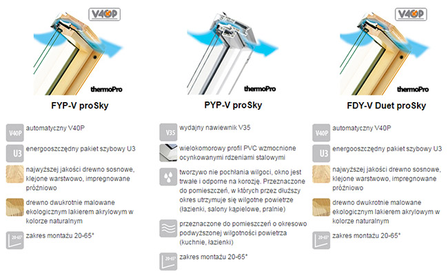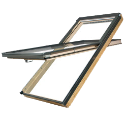 • Okno otwierane obrotowo lecz oś obrotu umieszczona jest powyżej połowy wysokości okna przez co nawet wysoka osoba może podejść do krawędzi otwartego okna. Dolna część skrzydła pełni rolę okna klapowego, a górna stanowi dodatkowe doświetlenie. Skrzydło przy obrocie o kąt od 0 - 40° podtrzymywane jest przez innowacyjny mechanizm wspomagający, który pozwala pozostawić otwarte skrzydło w dowolnej pozycji w tym zakresie. Jedyne okna dachowe na rynku, które po zamontowaniu w dachu o nachyleniu 39 - 43˚ spełniają warunki normy DIN 5034-1*, zgodnie z którymi dolna krawędź okna ma być na wysokości do 95 cm, a górna krawędź okna na wysokości minimum 220 cm od podłogi.