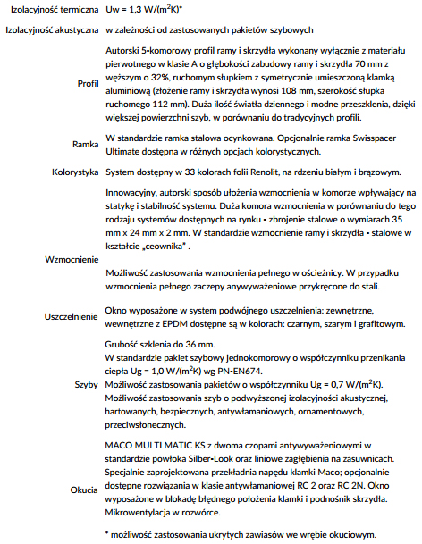 Autorski 5-komorowy profil ramy i skrzydła wykonany wyłącznie z materiału pierwotnego w klasie A o głębokości zabudowy ramy i skrzydła 70 mm z węższym o 32%, ruchomym słupkiem z symetrycznie umieszczoną klamką aluminiową (złożenie ramy i skrzydła wynosi 108 mm, szerokość słupka ruchomego 112 mm). Duża ilość światła dziennego i modne przeszklenia, dzięki większej powierzchni szyb, w porównaniu do tradycyjnych profili. | Grubość szklenia do 36 mm. W standardzie pakiet szybowy jednokomorowy o współczynniku przenikania ciepła Ug = 1,0 W/(m2K) wg PN-EN674. Możliwość zastosowania pakietów o współczynniku Ug = 0,7 W/(m2K). Możliwość zastosowania szyb o podwyższonej izolacyjności akustycznej, hartowanych, bezpiecznych, antywłamaniowych, ornamentowych, przeciwsłonecznych. | MACO MULTI MATIC KS z dwoma zaczepami antywyważeniowymi w standardzie powłoka Silber-Look oraz liniowe zagłębienia na zasuwnicach i opcjonalnie dostępne zawiasy ukryte we wrębie okuciowym; okno wyposażone w blokadę błędnego położenia klamki i podnośnik skrzydła*, mikrowentylacja w rozwórce**. Nowoczesne okucia twin-fit umożliwiające podwójny uchył okna za pomocą jednego ruchu klamki. |