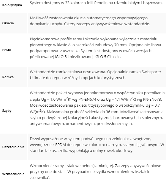 Pięciokomorowe profile ramy i skrzydła wykonane wyłącznie z materiału pierwotnego w klasie A, o szerokości zabudowy 70 mm. Opcjonalnie listwa podparapetowa z uszczelką System jest dostępny w dwóch wersjach: półzlicowanej IGLO 5 i niezlicowanej IGLO 5 CLassic. W standardzie pakiet szybowy jednokomorowy o współczynniku przenikania ciepła Ug = 1,0 W/(m2K) wg PN-EN674 oraz Ug = 1,1 W/(m2K) wg PN-EN673. Możliwość zastosowania pakietu trzyszybowego o współczynniku Ug = 0,7 W/(m2K). Maksymalna grubość szklenia do 36 mm. Możliwość zastosowania szyb o podwyższonej izolacyjności akustycznej, hartowanych, bezpiecznych, antywłamaniowych, ornamentowych, przeciwsłonecznych. Możliwość zastosowania okucia automatycznego wspomagającego domykanie uchyłu. Cztery zaczepy antywyważeniowe w standardzie.
