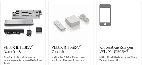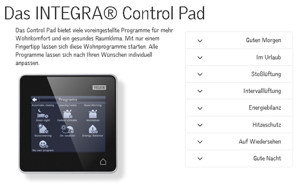 VELUX INTEGRA® ist eine Produktfamilie, die Ihnen das Leben leichter macht. Alle Produkte – Fenster, Rollläden und Sonnenschutz – haben einen Elektro- oder Solarantrieb und lassen sich mit dem eleganten VELUX INTEGRA® Control Pad intuitiv bedienen. Tippen Sie einfach auf das gewünschte Touchscreen-Symbol oder wählen Sie eins der vordefinierten Programme. Alle Produkte nutzen den sicheren Funkstandard io-homecontrol® zur Hausautomation.