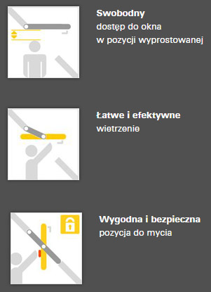 • wygodna obsługa: jedna, umieszczona u dołu okna klamka odpowiedzialna za wszystkie funkcje okna